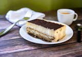 Espresso drenched cake, layered with mascarpone cheese mousse, sprinkled with cocoa sugar.