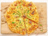 Pizza in-house ranch sauce base, grilled chicken breast, fresh garlic, red onions, beef bacon bits, and tomatoes.