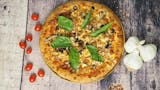 Basil pesto sauce base, grilled chicken breast, red onions, mushrooms, mozzarella cheese, and Goat cheese.